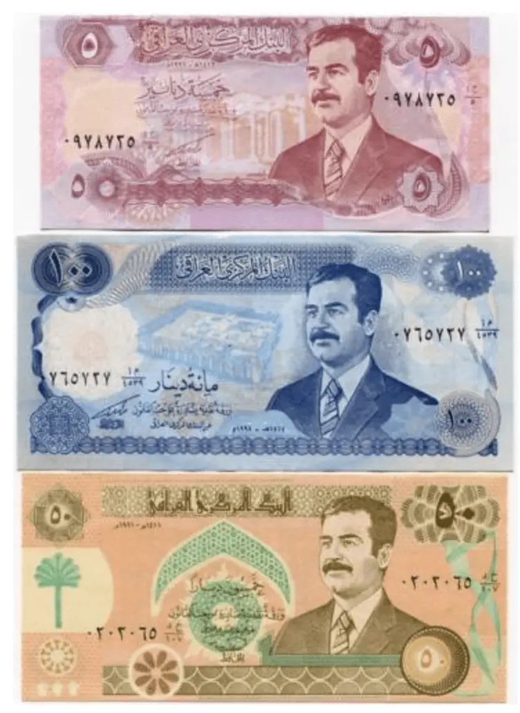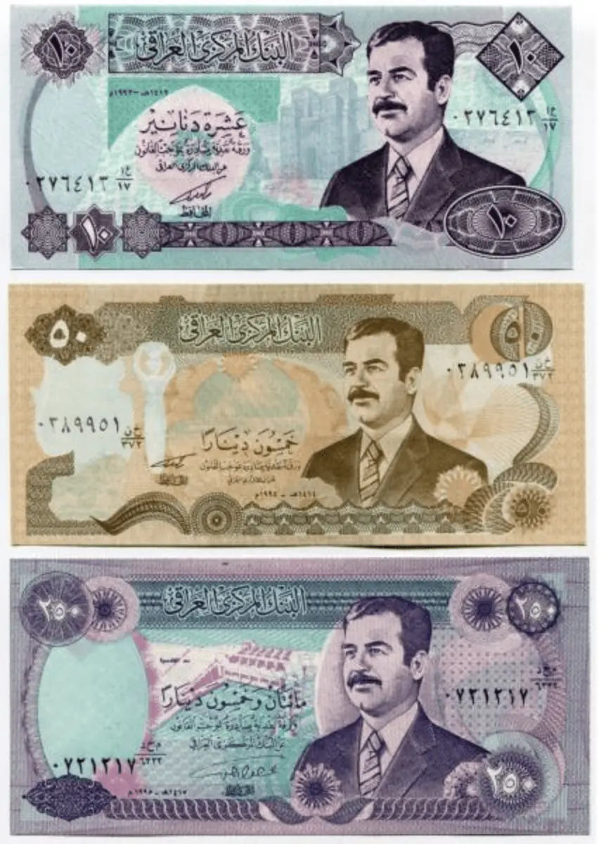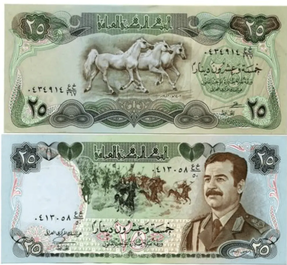 – P# 73 : 1986 25 Dinars SWISS w/ Saddam’s portrait